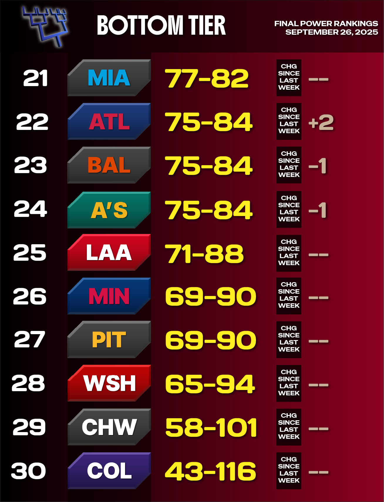 Milwaukee will end the regular season having been on top of our power rankings for nine weeks in a row. Remember, this is a squad that got off to a rough start in 2025, but surged to win their division, and will likely hold the best record in baseball when it’s all over.