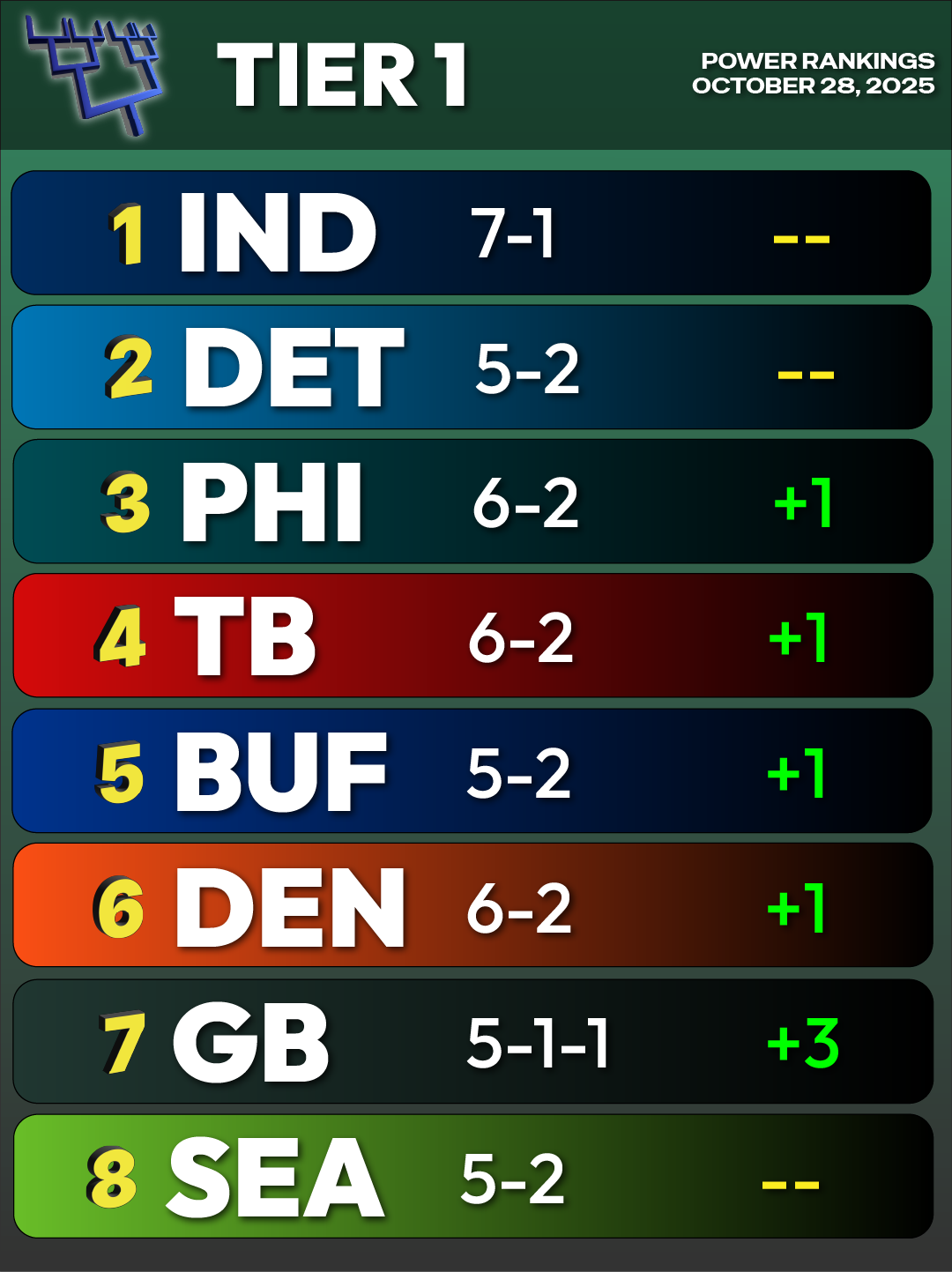 NFL Power Rankings - Tier 1 - Teams 1-8 - 10-28-2025 - 1 Indianapolis, 2 Detroit, 3 Philadelphia, 4 Tampa Bay, 5 Buffalo, 6 Denver, 7 Green Bay, 8 Seattle