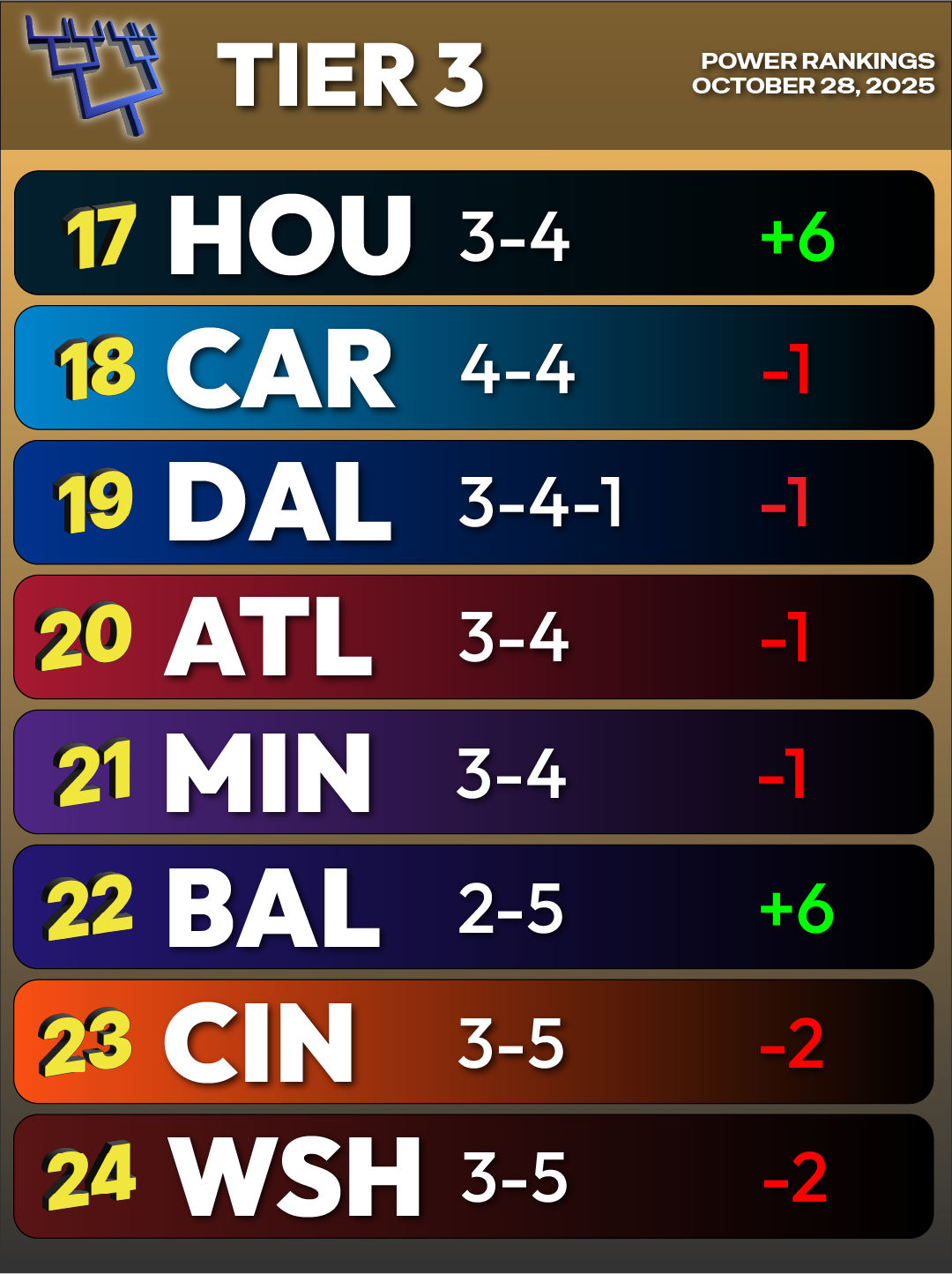 NFL Power Rankings - Tier 3 - Teams 17-24 - 10-28-2025 - 17 Houston, 18 Carolina, 19 Dallas, 20 Atlanta, 21 Minnesota, 22 Baltimore, 23 Cincinnati, 24 Washington